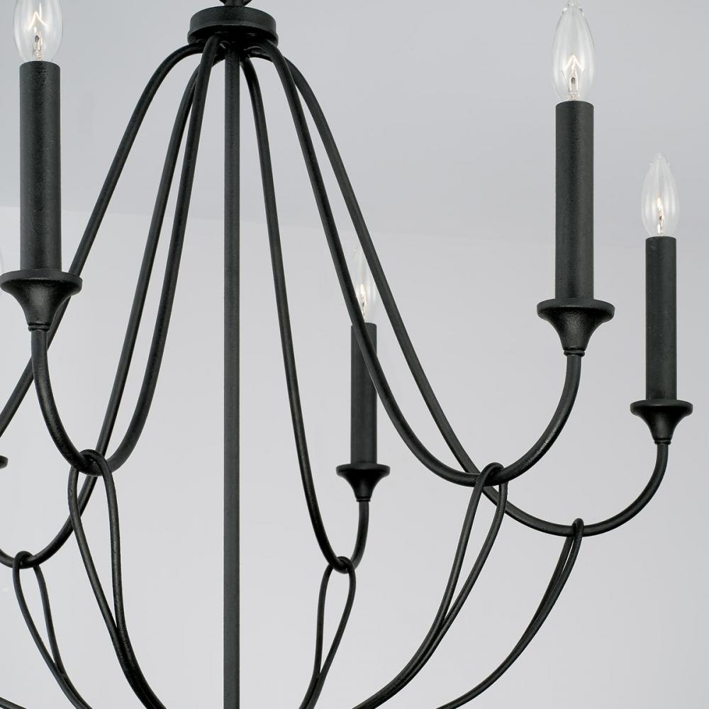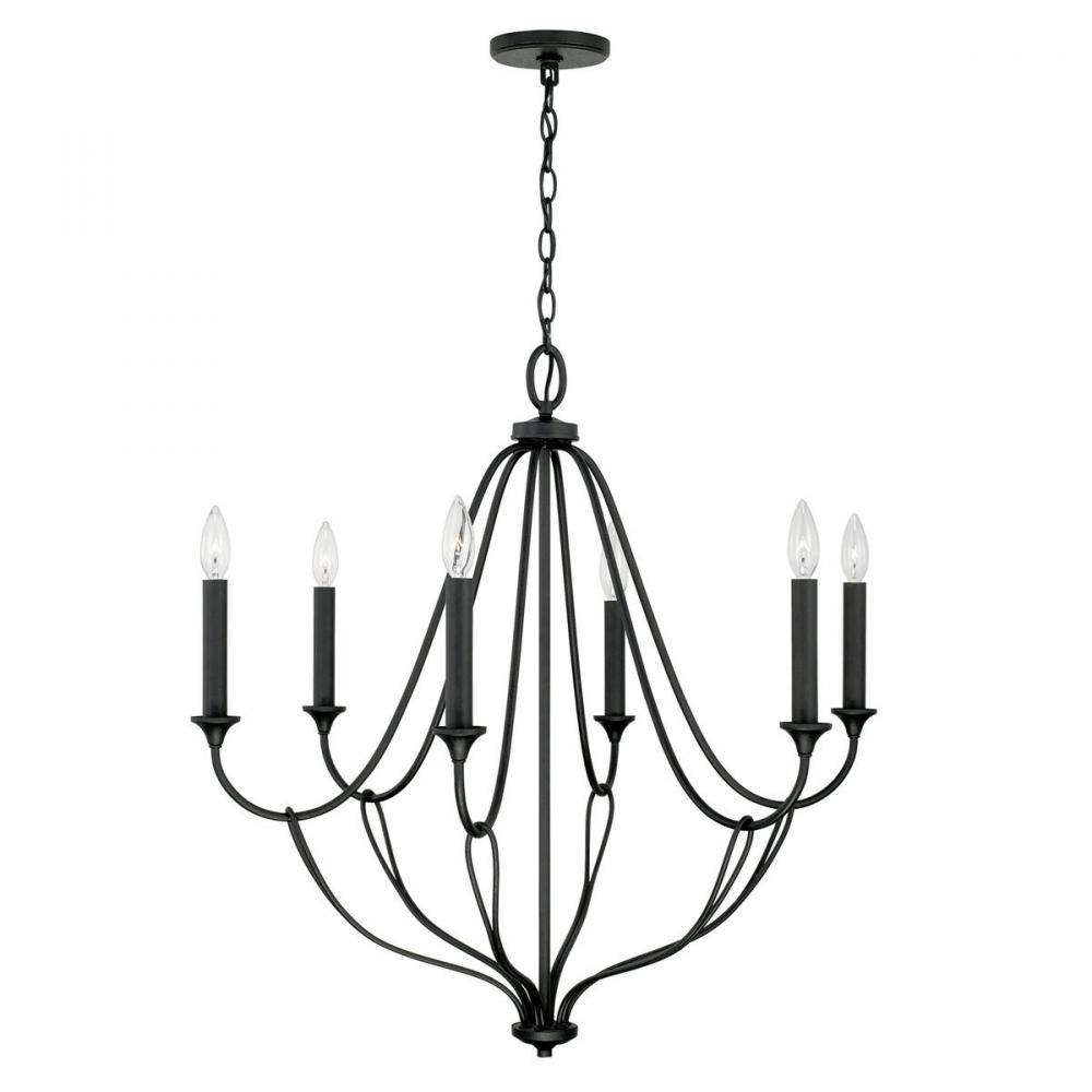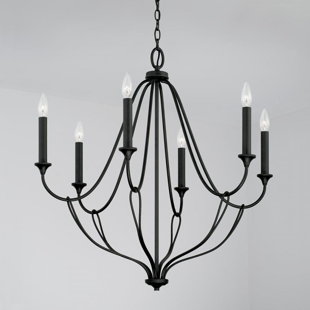 The whimsical silhouette and artistic loop detailing make a sculptural statement with the Bentley 6-Light Chandelier. The rugged texture of the Black Iron finish adds character to the airy design. This chandelier is available in multiple sizes.