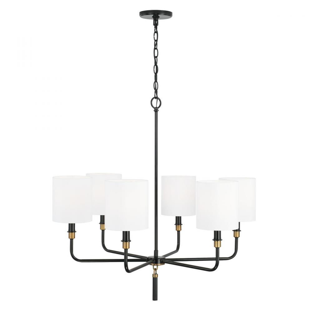 The striking contrast of Glossy Black with tailored fabric shades gives a perfectly polished look to the Beckham 6-Light Chandelier. The solid metal tassel detail is accented with Aged Brass loops for a sleek silhouette that is both bold and refined.