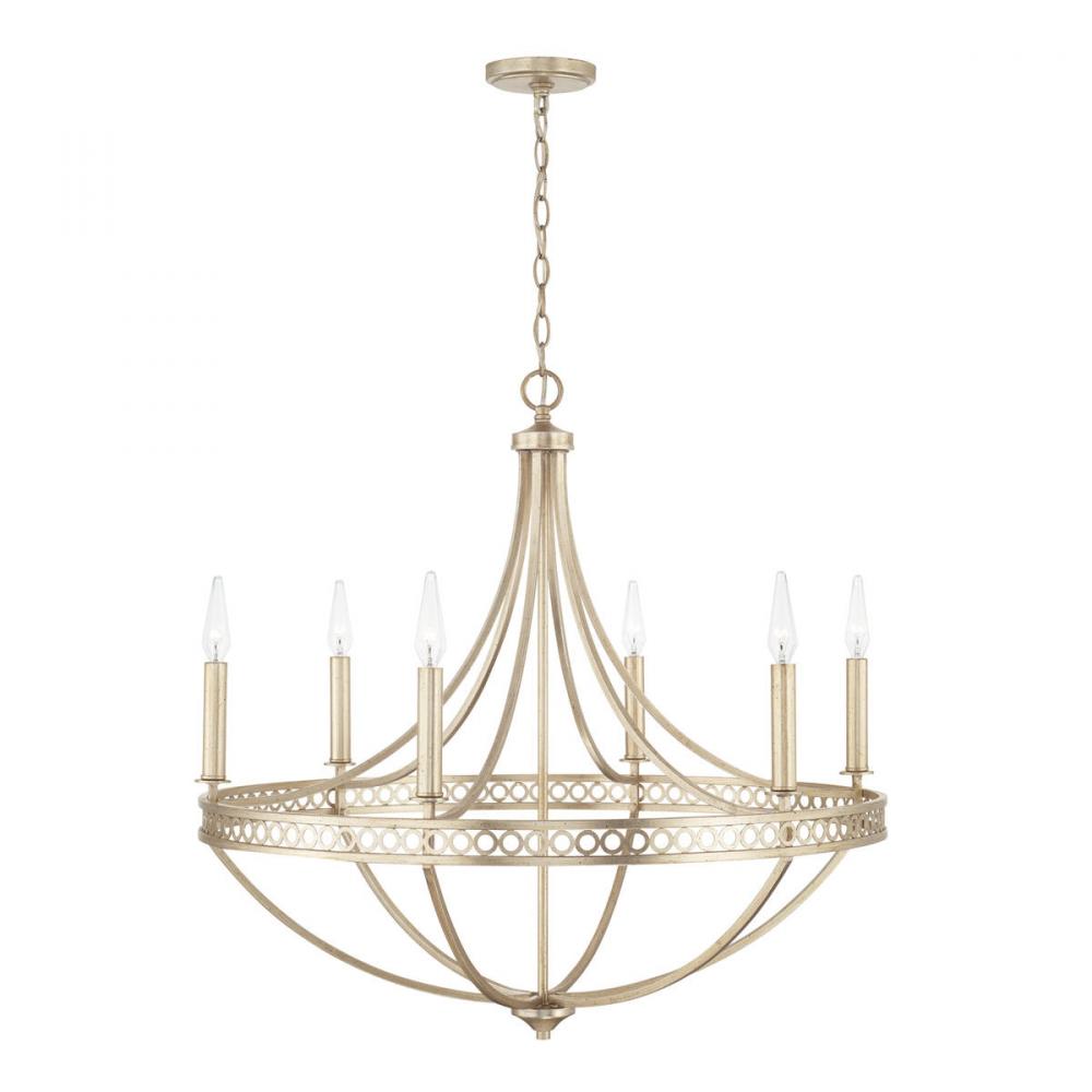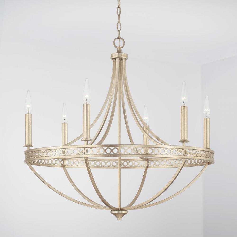 Graceful curves and an ornate pattern create the Isabella 6-Light Chandelier. The intricate band of circles is finished in Winter Gold for a relaxed, yet regal style.