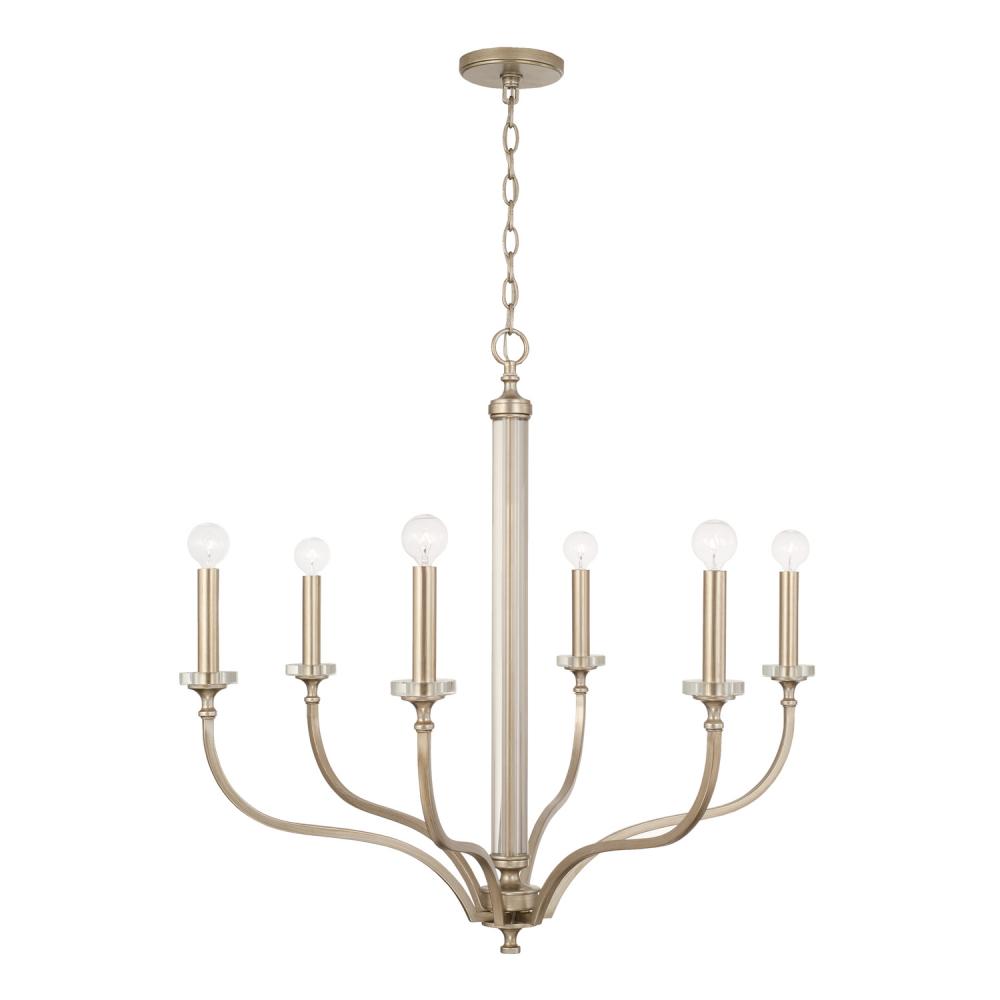 The romantic curves of the Breigh Medium Chandelier creates a soft, sophisticated style. The Brushed Champagne finish adds a subtle texture and glistens off the acrylic accents for a look with understated glamour.