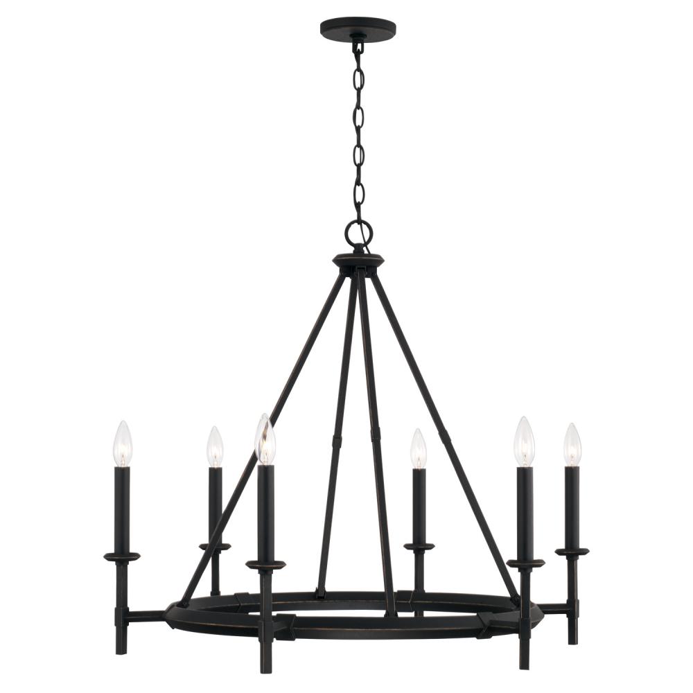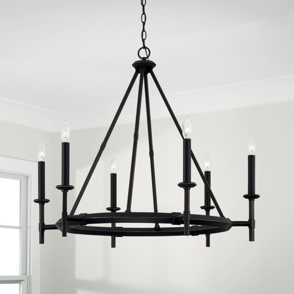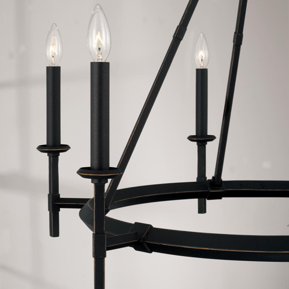 Bold and classic, the Ogden Medium Chandelier brings a modern look to turn-of-the-century style. The Brushed Black Iron finish adds visual texture, and the gold highlights accent the bias angle of the ring frame.