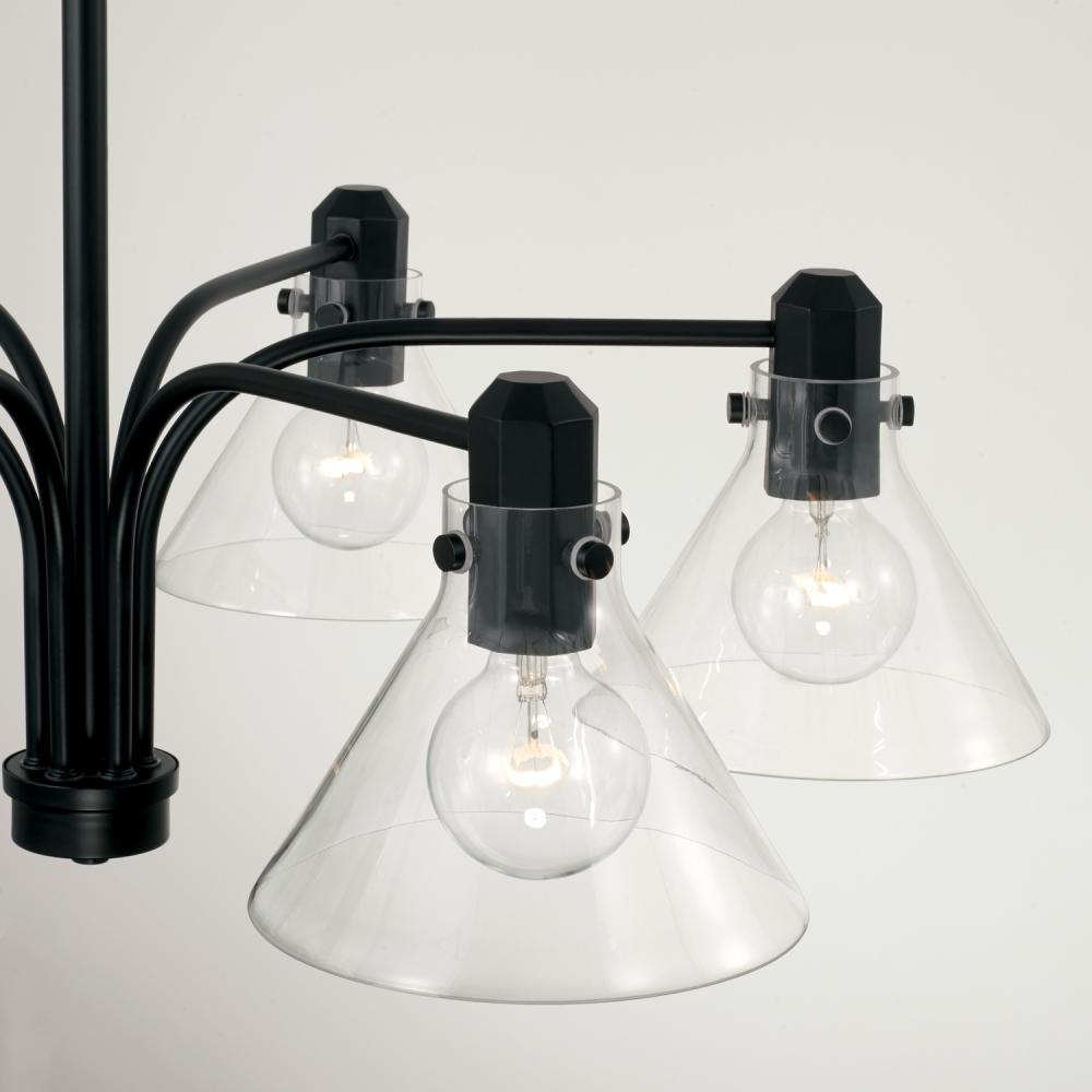 A modern take on midcentury style, the Greer Chandelier brings understated style to any space. The faceted socket and rivet details in Matte Black adds a pop of personality to the tapered glass.