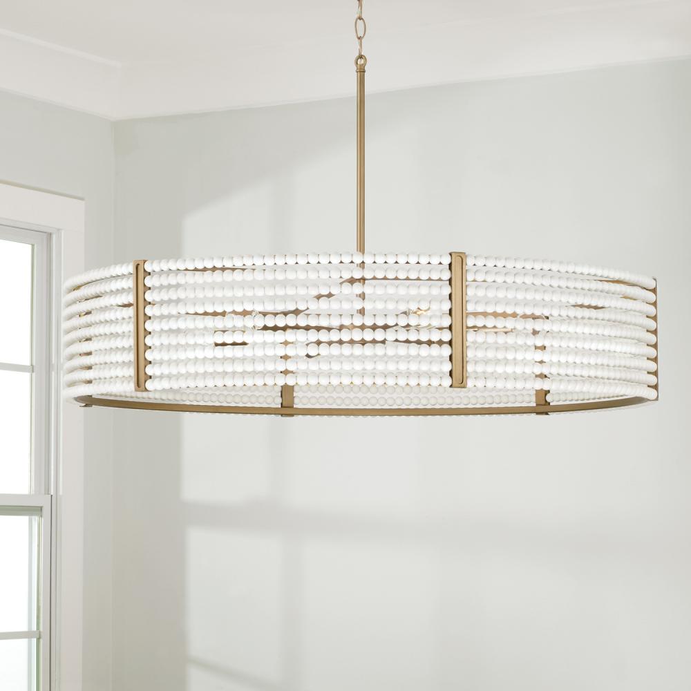 Glitz and glamour meet bohemian chic with the Brynn Chandelier. The rings of matte white beads paired with the golden tones of the Painted Aged Brass finish bring laid back luxury to life.