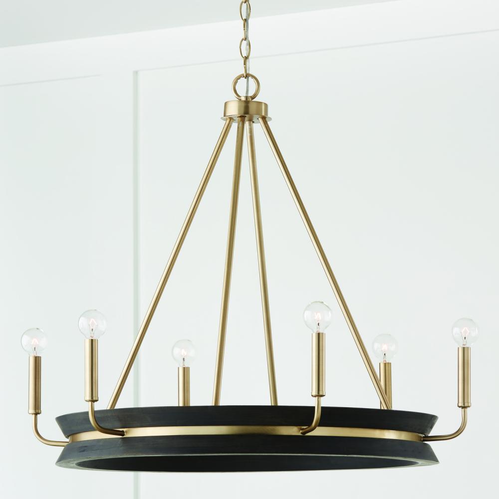 31"W x 27.25"H 6-Light Chandelier in Black Stain Wood and Matte Brass
