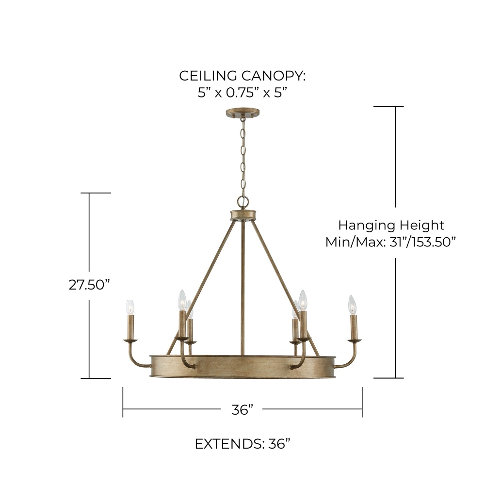 DIMENSIONS: Overall: 36"W x 27.5"H; Adjustable Hanging Height: 31" - 153.5"; Includes 120" Chain; 180" Wire.