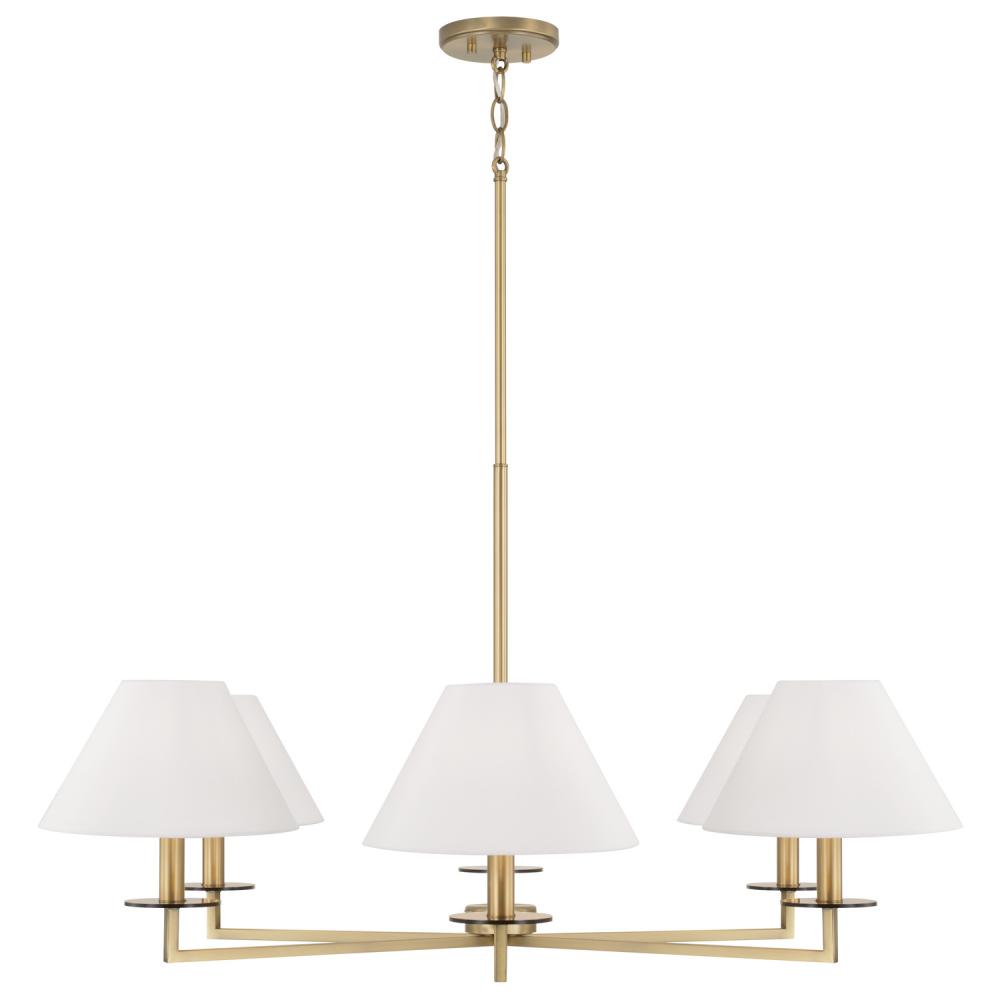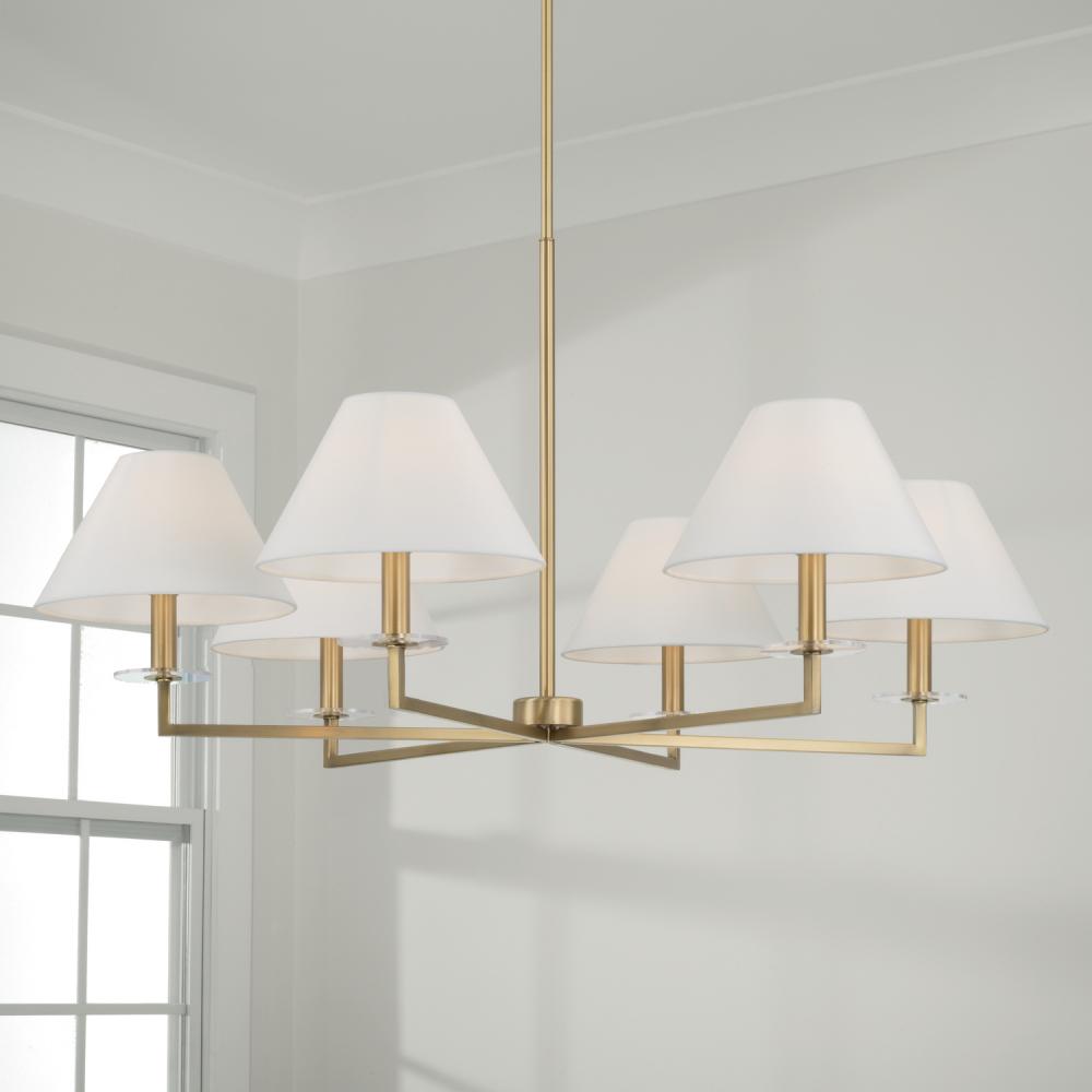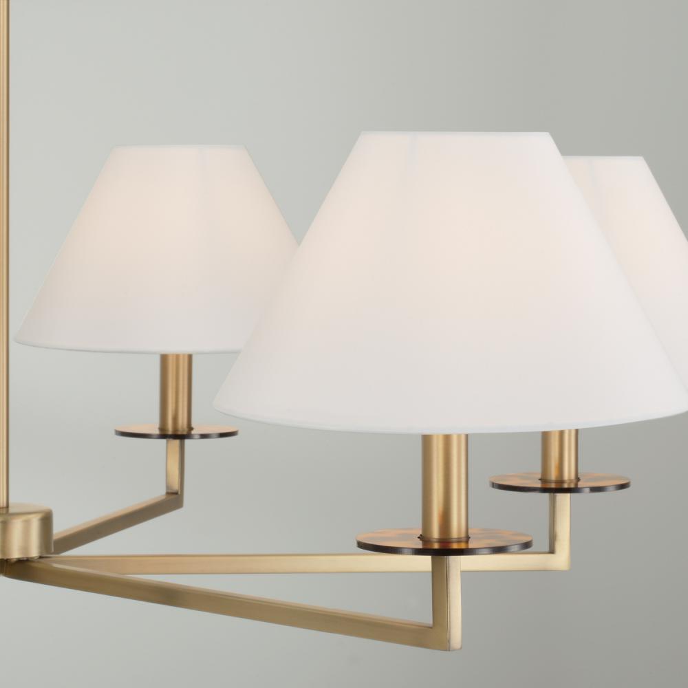 The decadence is in the details. The Gilda Large Chandelier brings the glamour with interchangeable tortoise shell or clear acrylic bobeches. The Aged Brass finish adds a warm tone, while the tapered White fabric stay-straight shades and squared arms create a crisp, classic aesthetic.