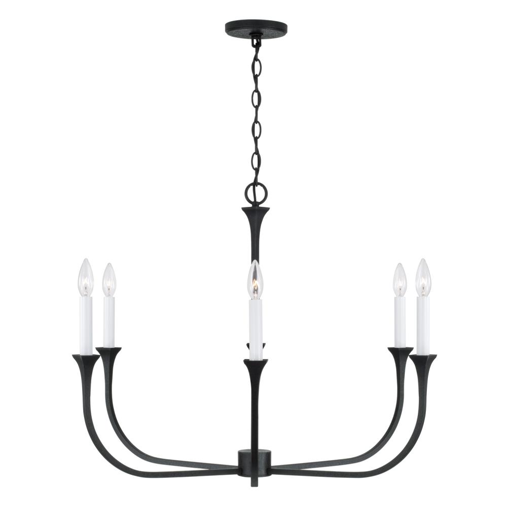 A timeless luminaire, the Decklan 6-Light Chandelier offers elegance with options. The textured Black Iron arms curve upward into flared bases for interchangeable candle sleeves – with both Matte White and Black Iron finishes included – to create tailored style in any space.