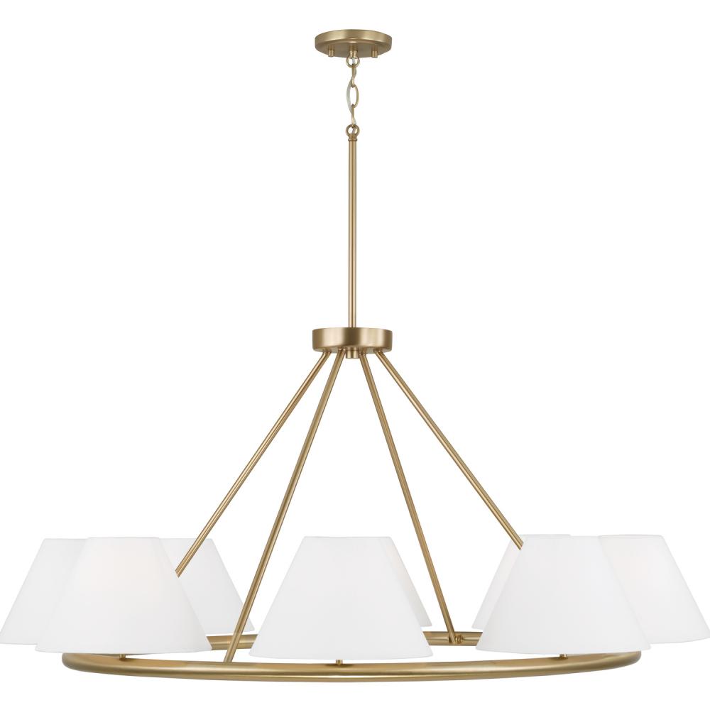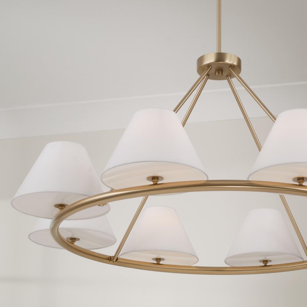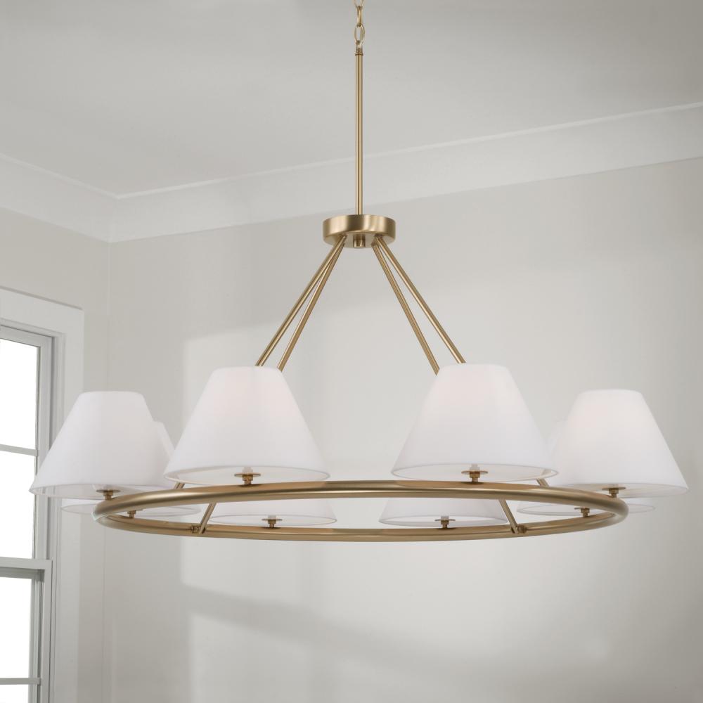 Transitional style meets modern details in the Parson 8-Light Ring Chandelier. The tailored fabric shades and glass diffusers evoke a sophisticated aesthetic, while the sleek ring base delivers a subtle shine in the Matte Brass finish.