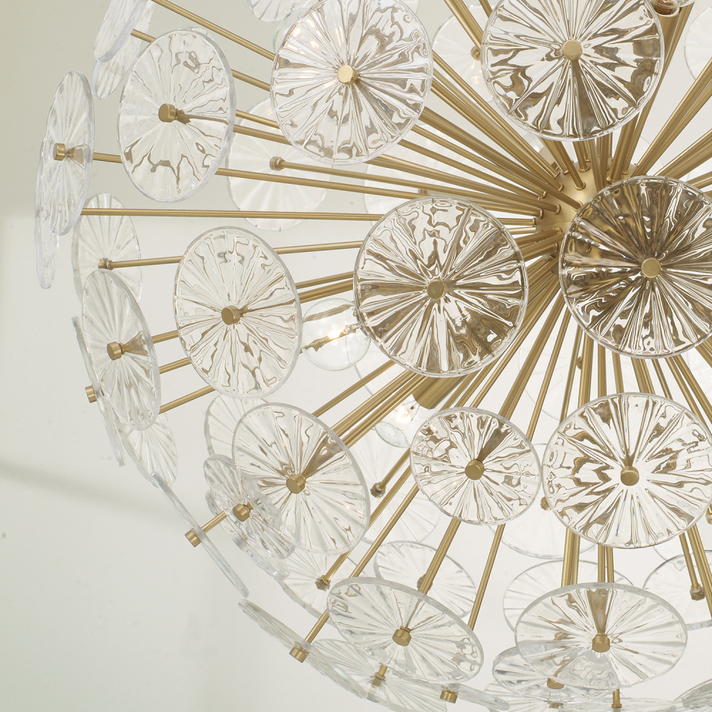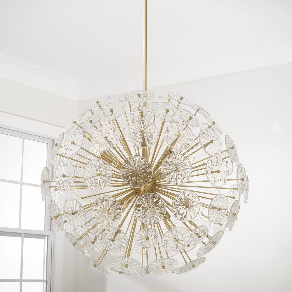 In a starburst of pressed glass petals, the Emelie Chandelier creates an effervescent presentation of nature-inspired design. The handcrafted, clear patterned glass offers stunning illumination, perfectly complemented by the Matte Brass stems for gorgeous, statement-making style.