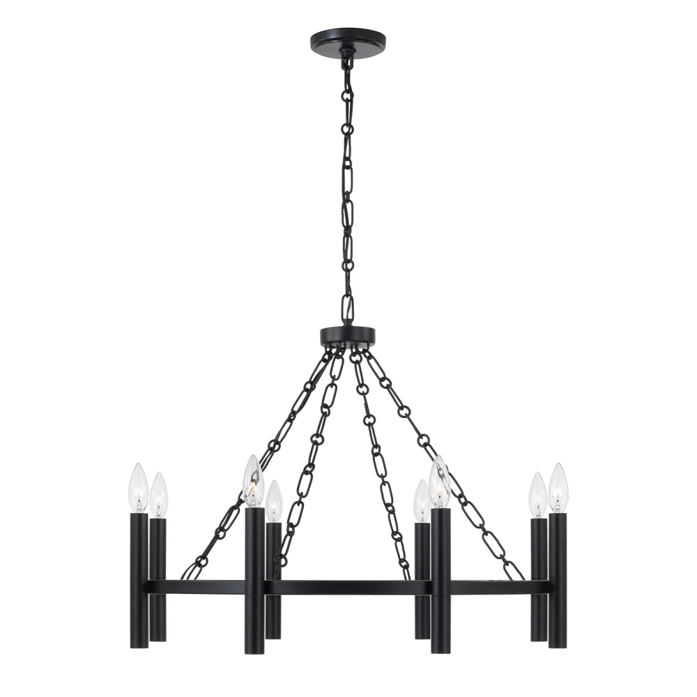 A classic ring silhouette and designer details create the Winton Small Chandelier. Placed on the outside of the frame, the candle sleeves extend beyond the bottom of the ring, held by alternating loop chains for a unique take on the traditional style. The Matte Black finish punctuates the style.