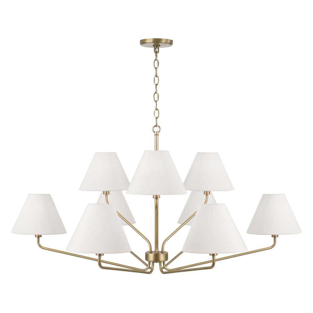 Soft angles and classic style create the Chadwick Two-Tier Chandelier. The tapered White fabric shades bring a visual balance to the elegant metal arms, finished in Aged Brass for a mid-century touch of shine.