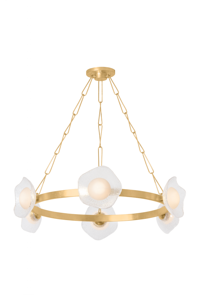 Combining organic and modern elements, Almandine is an elevated take on a traditional ring chandelier. The minimalist frame is accented with floral-shaped shades hand-cut from fluted piastre glass. Finished in Vintage Gold Leaf, the restrained metalwork allows the beauty of the blooms to shine. Almandine is available as a single-tier chandelier with 6 or 9 lights, a double-tier chandelier with 15 lights, and a single-light wall sconce.
