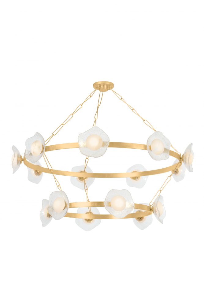 Combining organic and modern elements, Almandine is an elevated take on a traditional ring chandelier. The minimalist frame is accented with floral-shaped shades hand-cut from fluted piastre glass. Finished in Vintage Gold Leaf, the restrained metalwork allows the beauty of the blooms to shine. Almandine is available as a single-tier chandelier with 6 or 9 lights, a double-tier chandelier with 15 lights, and a single-light wall sconce.