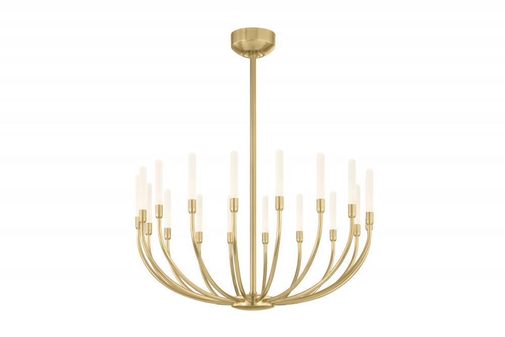 Defined by a poetic, gestural array of sweeping arms, the family of Amalthea is alluring and modern. Perched at the tip of each arm is a thin etched acrylic rod, end-lit with LED. While reminiscent of slender torches, the Vintage Brass branches also come across as organic. Each variation in this family, including a 3-light sconce and 18 or 30-light chandelier offers distinctive visual appeal while providing a lighting solution to meet the needs of your space.