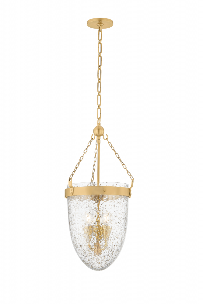 The clean lines, delicate chains, and statement drop shade of Angus offer a contemporary take on a lantern silhouette. The Mica glass shade is characterized by unique bubbles that give the surface a watery appearance. A Vintage Brass band with nodules anchors the fixture with an antique look. Available with 3 or 4 lights.
