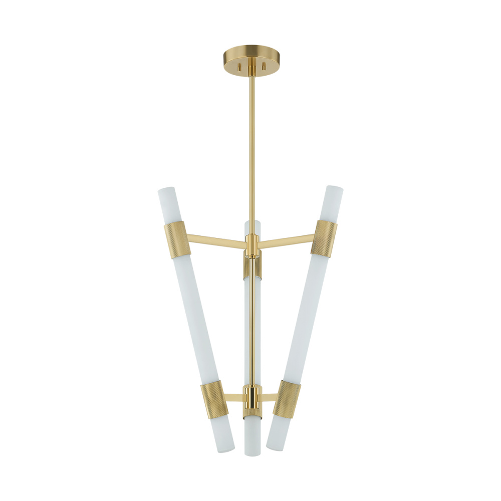 The futuristic design of Krakow uses minimalist forms to create a maximalist statement. Simple matte cloud glass tubes are illuminated by LED, providing bright overhead lighting without a harsh glare. Warm Vintage Brass cuffs with ribbed detailing support the shades, which tilt away from the frame to disperse light and create a striking visual impression from below. Available in two sizes, Krakow is a perfect choice for open staircases, grand foyers, or any area in need of a showstopping feature.