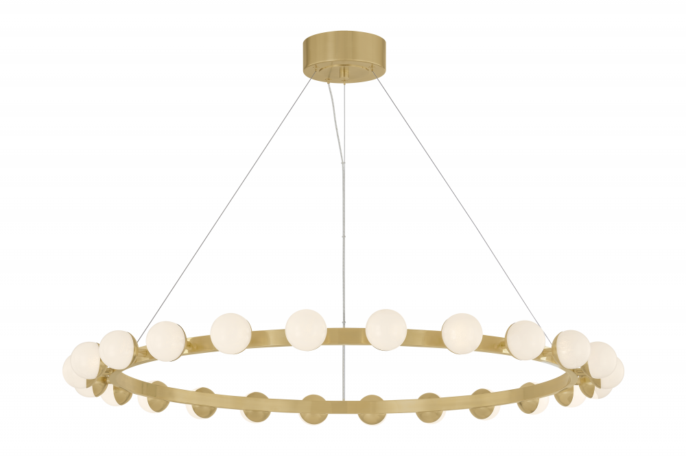 Elements of repetition and scale are skillfully balanced in the Linus chandelier to create a striking visual impact. Finished in Vintage Brass, the concentric rings that form the framework support a series of globes. Marked by a unique, crackled effect, the antique quality of the White Luna glass adds an air of artistry. What sets this family apart is its versatility: despite the five distinct options, only three rings are used to create an array of configurations.