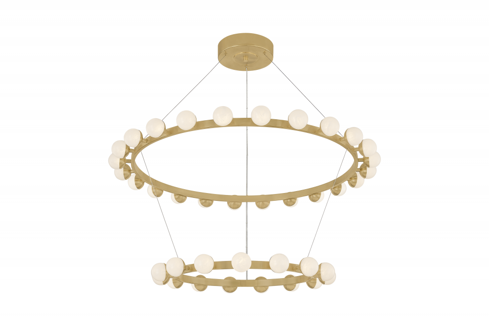 Elements of repetition and scale are skillfully balanced in the Linus chandelier to create a striking visual impact. Finished in Vintage Brass, the concentric rings that form the framework support a series of globes. Marked by a unique, crackled effect, the antique quality of the White Luna glass adds an air of artistry. What sets this family apart is its versatility: despite the five distinct options, only three rings are used to create an array of configurations.