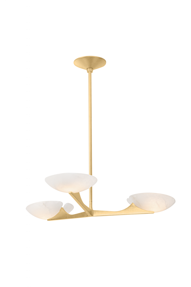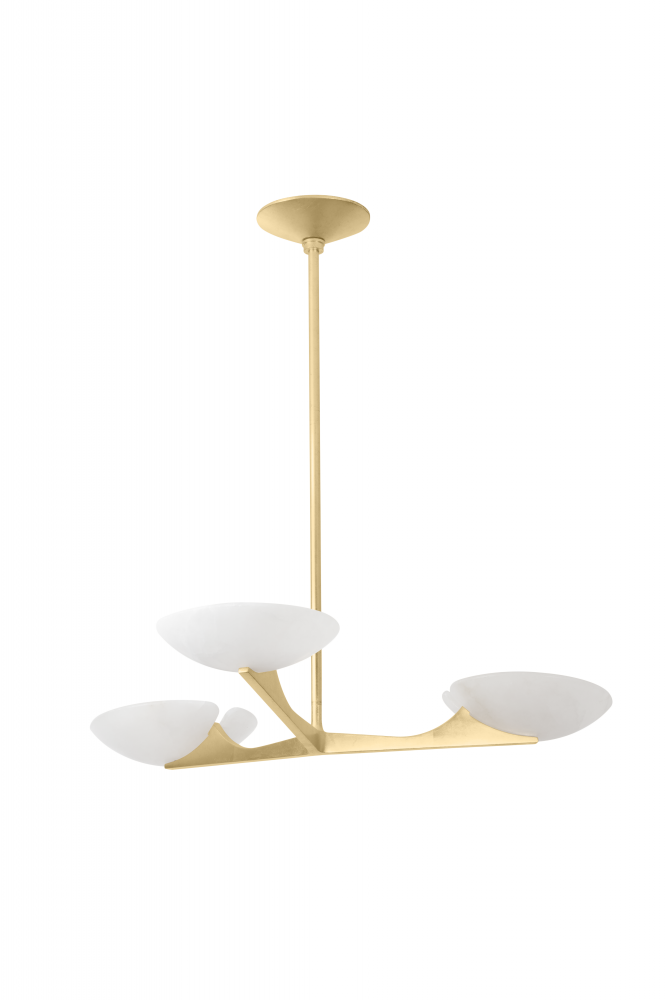 Embracing modernism with elevated materials, Malachite is a versatile chandelier for living and dining spaces. Arrayed evenly from a center point, each arm on the fixture culminates in a 10” bowl shade filled with light. The combination of natural alabaster and Vintage Gold Leaf results in a luxurious finish. Malachite is available with 3 or 5-lights.