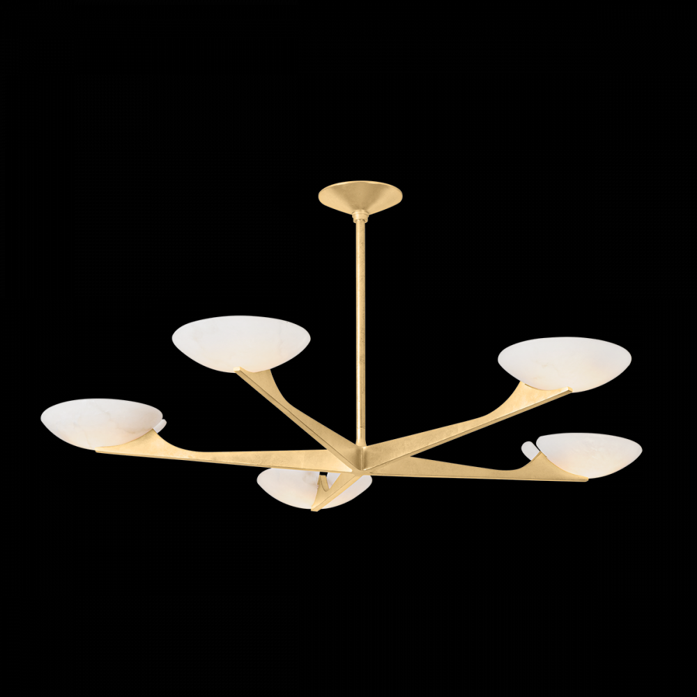 Embracing modernism with elevated materials, Malachite is a versatile chandelier for living and dining spaces. Arrayed evenly from a center point, each arm on the fixture culminates in a 10” bowl shade filled with light. The combination of natural alabaster and Vintage Gold Leaf results in a luxurious finish. Malachite is available with 3 or 5-lights.