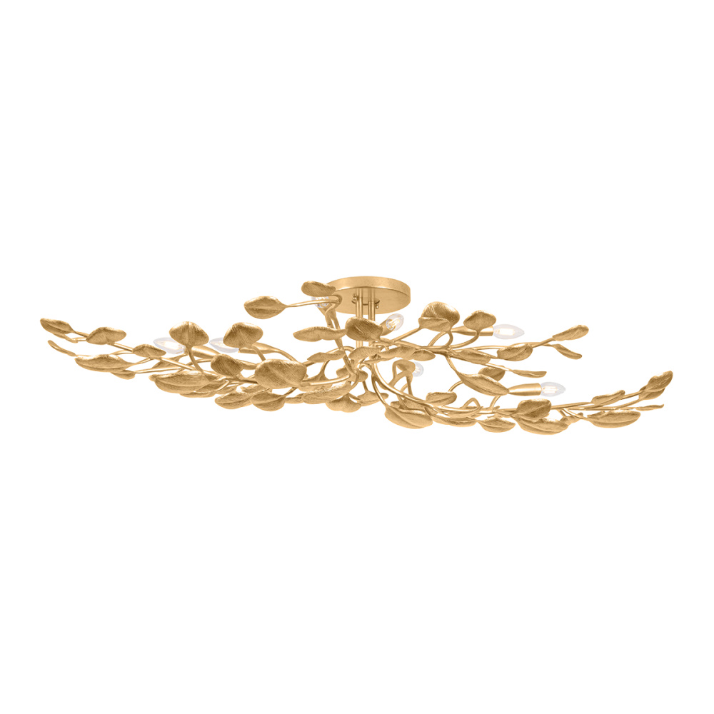 An overscale, exuberant expression of botanical beauty, Menorca animates a space. The design takes inspiration from eucalyptus leaves, which are illuminated from behind to create a dramatic, sculptural moment. The slight abstraction to the forms feels futuristic, while the Vintage Gold Leaf finish adds a luxurious note. Available as a sconce or semi-flush mount in two sizes, Menorca brings a touch of the wild and wondrous into your home.