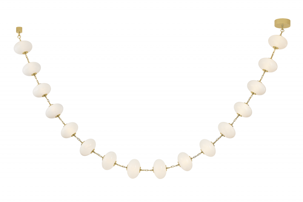 Echoing the artistry of bespoke installations and the graceful allure of fine jewelry, Nephele floats elegantly in space, resembling a string of luminous pearls suspended in perfect harmony. Each softly glowing cloud glass orb is held in place by intricately detailed Vintage Polished Brass links, creating a striking interplay of light and form. Available in 8, 12, or 16-light LED-lit chandeliers, as well as a 1-light wall sconce, Nephele captivates the senses with its fluid silhouette and exquisite craftsmanship. This artful statement piece offers a refined elegance that elevates interiors with its sculptural presence.