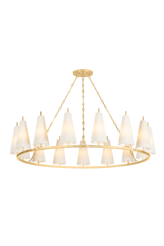 While simplistic, the natural silk shades and circular motifs of the Tirana family nod to a nautical spirit. The conical shades provide a contemporary lightness to the traditional silhouettes. By contrast, the delicately textured Vintage Gold Leaf metalwork catches the light like a modish bangle bracelet. Available as a 1-light sconce and a 12-light, 15-light, and 27-light chandelier, Tirana produces warm, refined lighting for transitional spaces.