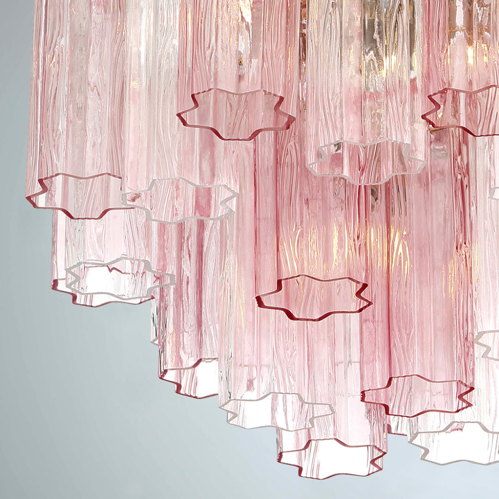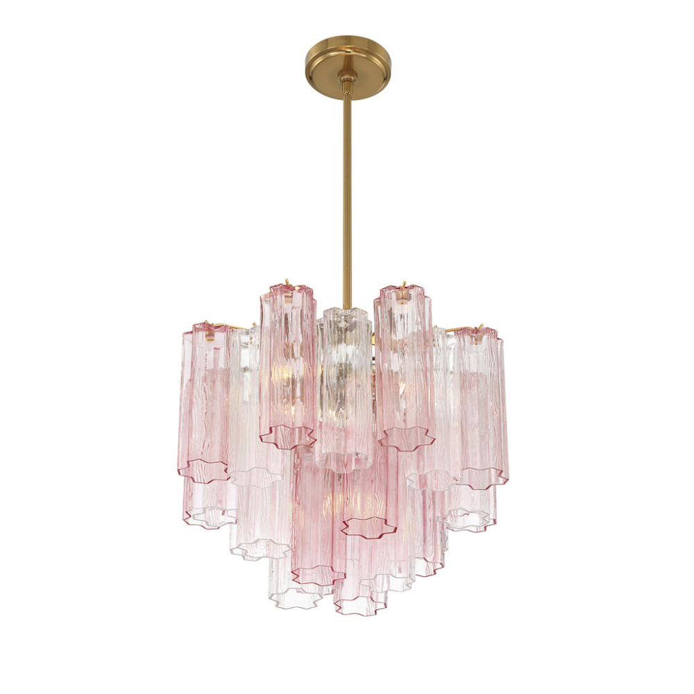 The captivating Addis Lighting Collection is a modern-day interpretation of the iconic mid-century Tronchi chandelier. Inspired by its predecessor's sleek lines and geometric shapes, the Addis features a polished Chrome or Aged Brass metal frame that exudes sophistication and style. Its unique design showcases transparent tiers of textured Tronchi glass tubes, forming a mesmerizing 5-point rounded star shape. Choose from a range of glass colors, including clear, amber, smoke, and white, or the stunning Autumn option, which features a captivating multicolor disposition of amber, clear, and smoke Tronchi glass. The Addis Lighting Collection offers various sizes and finishes, allowing you to find the perfect fit for your space while adding a touch of timeless elegance.