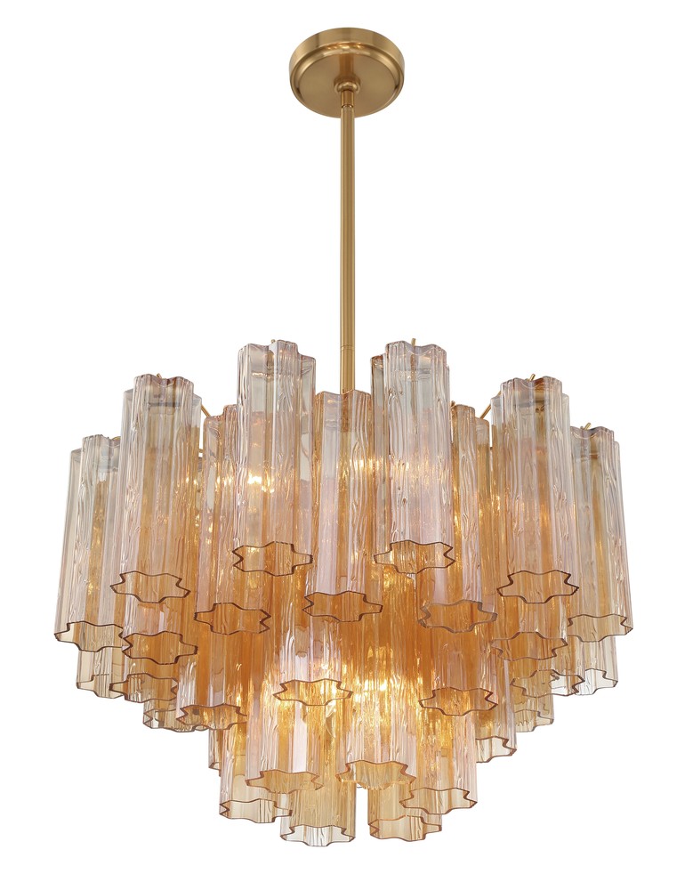 The captivating Addis Lighting Collection is a modern-day interpretation of the iconic mid-century Tronchi chandelier. Inspired by its predecessor's sleek lines and geometric shapes, the Addis features a polished Chrome or Aged Brass metal frame that exudes sophistication and style. Its unique design showcases transparent tiers of textured Tronchi glass tubes, forming a mesmerizing 5-point rounded star shape. Choose from a range of glass colors, including clear, amber, smoke, and white, or the stunning Autumn option, which features a captivating multicolor disposition of amber, clear, and smoke Tronchi glass. The Addis Lighting Collection offers various sizes and finishes, allowing you to find the perfect fit for your space while adding a touch of timeless elegance.