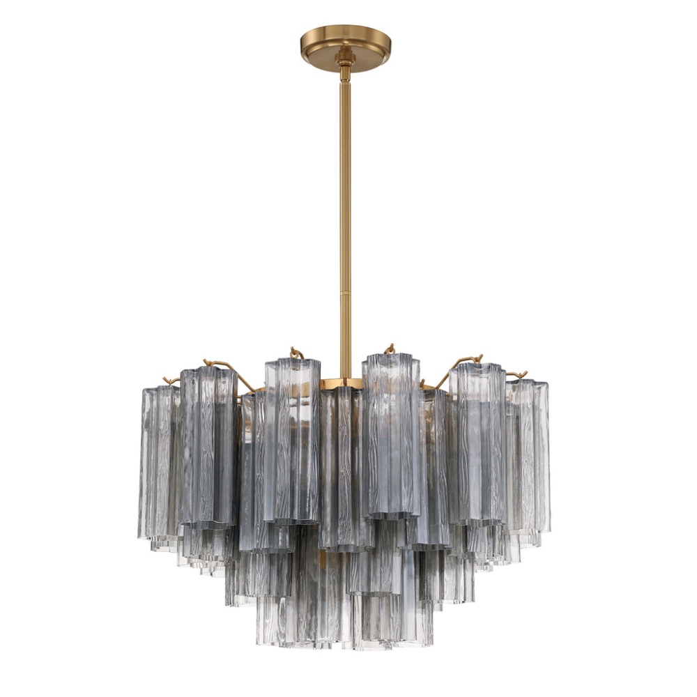 The captivating Addis Lighting Collection is a modern-day interpretation of the iconic mid-century Tronchi chandelier. Inspired by its predecessor's sleek lines and geometric shapes, the Addis features a polished Chrome or Aged Brass metal frame that exudes sophistication and style. Its unique design showcases transparent tiers of textured Tronchi glass tubes, forming a mesmerizing 5-point rounded star shape. Choose from a range of glass colors, including clear, amber, smoke, and white, or the stunning Autumn option, which features a captivating multicolor disposition of amber, clear, and smoke Tronchi glass. The Addis Lighting Collection offers various sizes and finishes, allowing you to find the perfect fit for your space while adding a touch of timeless elegance.