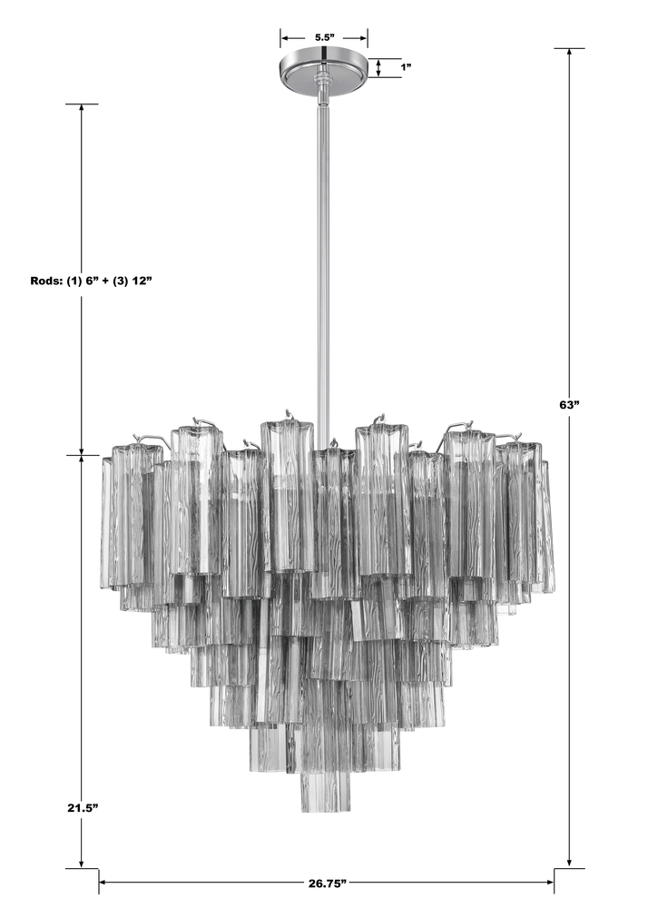 The captivating Addis Lighting Collection is a modern-day interpretation of the iconic mid-century Tronchi chandelier. Inspired by its predecessor's sleek lines and geometric shapes, the Addis features a polished Chrome or Aged Brass metal frame that exudes sophistication and style. Its unique design showcases transparent tiers of textured Tronchi glass tubes, forming a mesmerizing 5-point rounded star shape. Choose from a range of glass colors, including clear, amber, smoke, and white, or the stunning Autumn option, which features a captivating multicolor disposition of amber, clear, and smoke Tronchi glass. The Addis Lighting Collection offers various sizes and finishes, allowing you to find the perfect fit for your space while adding a touch of timeless elegance.