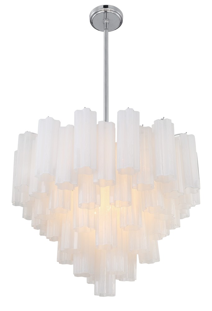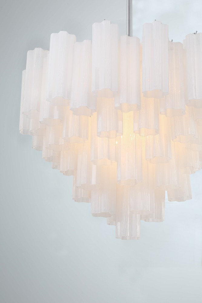 The captivating Addis Lighting Collection is a modern-day interpretation of the iconic mid-century Tronchi chandelier. Inspired by its predecessor's sleek lines and geometric shapes, the Addis features a polished Chrome or Aged Brass metal frame that exudes sophistication and style. Its unique design showcases transparent tiers of textured Tronchi glass tubes, forming a mesmerizing 5-point rounded star shape. Choose from a range of glass colors, including clear, amber, smoke, and white, or the stunning Autumn option, which features a captivating multicolor disposition of amber, clear, and smoke Tronchi glass. The Addis Lighting Collection offers various sizes and finishes, allowing you to find the perfect fit for your space while adding a touch of timeless elegance.