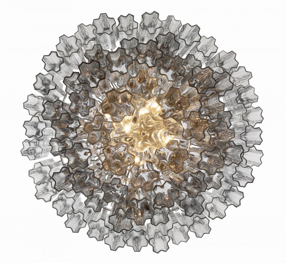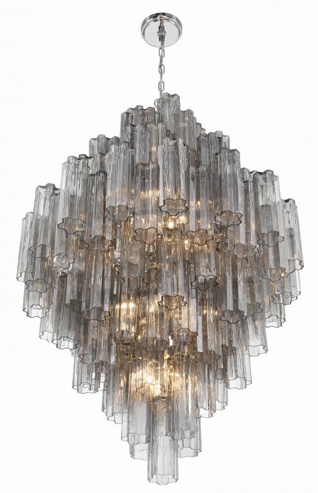 The captivating Addis Lighting Collection is a modern-day interpretation of the iconic mid-century Tronchi chandelier. Inspired by its predecessor's sleek lines and geometric shapes, the Addis features a polished Chrome or Aged Brass metal frame that exudes sophistication and style. Its unique design showcases transparent tiers of textured Tronchi glass tubes, forming a mesmerizing 5-point rounded star shape. Choose from a range of glass colors, including clear, amber, smoke, and white, or the stunning Autumn option, which features a captivating multicolor disposition of amber, clear, and smoke Tronchi glass. The Addis Lighting Collection offers various sizes and finishes, allowing you to find the perfect fit for your space while adding a touch of timeless elegance.