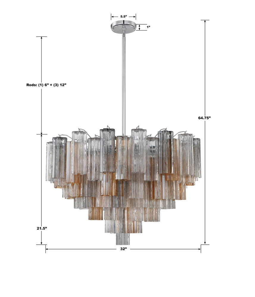 The captivating Addis Lighting Collection is a modern-day interpretation of the iconic mid-century Tronchi chandelier. Inspired by its predecessor's sleek lines and geometric shapes, the Addis features a polished Chrome or Aged Brass metal frame that exudes sophistication and style. Its unique design showcases transparent tiers of textured Tronchi glass tubes, forming a mesmerizing 5-point rounded star shape. Choose from a range of glass colors, including clear, amber, smoke, and white, or the stunning Autumn option, which features a captivating multicolor disposition of amber, clear, and smoke Tronchi glass. The Addis Lighting Collection offers various sizes and finishes, allowing you to find the perfect fit for your space while adding a touch of timeless elegance.