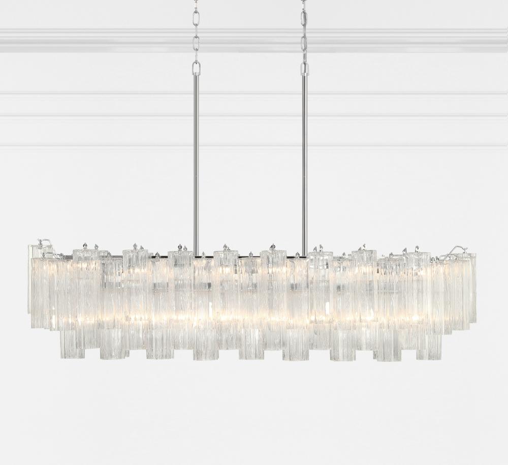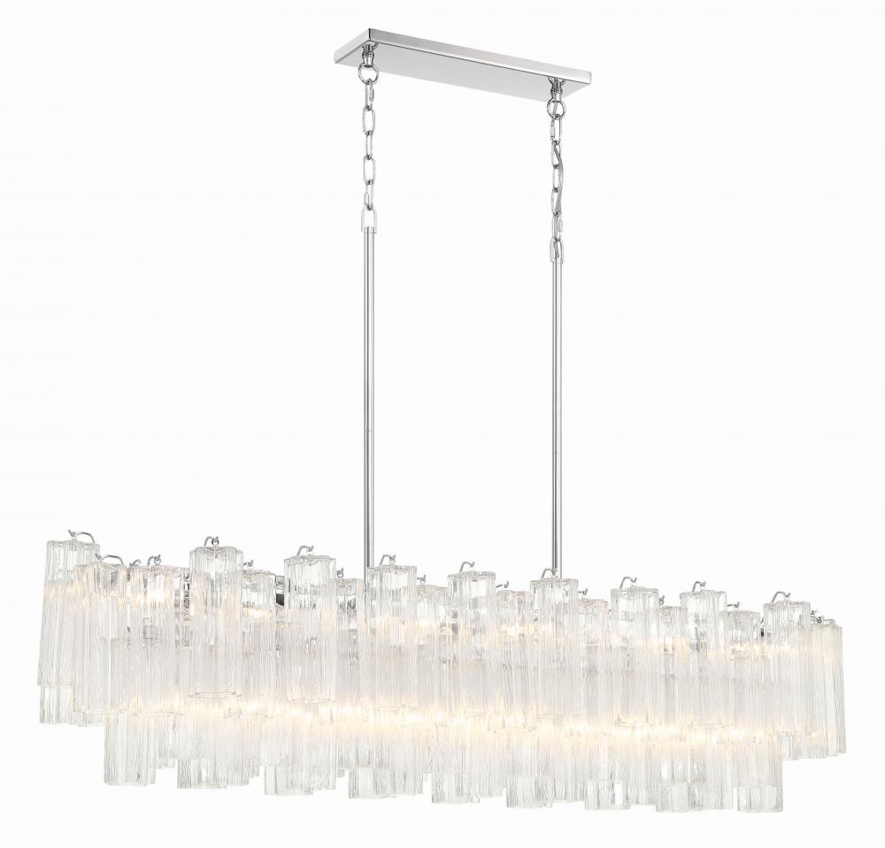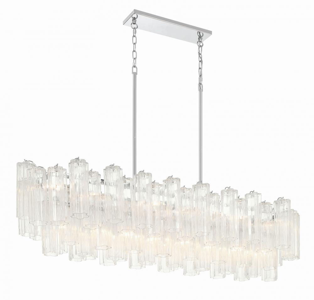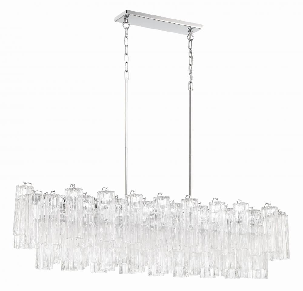 The captivating Addis Lighting Collection is a modern-day interpretation of the iconic mid-century Tronchi chandelier. Inspired by its predecessor's sleek lines and geometric shapes, the Addis features a polished Chrome or Aged Brass metal frame that exudes sophistication and style. Its unique design showcases transparent tiers of textured Tronchi glass tubes, forming a mesmerizing 5-point rounded star shape. Choose from a range of glass colors, including clear, amber, smoke, and white, or the stunning Autumn option, which features a captivating multicolor disposition of amber, clear, and smoke Tronchi glass. The Addis Lighting Collection offers various sizes and finishes, allowing you to find the perfect fit for your space while adding a touch of timeless elegance.