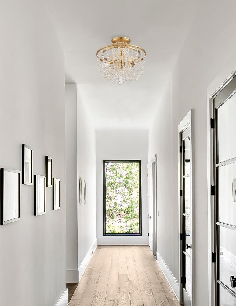 The glamorous Arcadia light features strands of faceted cut crystal jewels draped from a simple frame, creating a bowl-shaped silhouette. Designed to grace a bedroom, hallway, or entry this dazzling fixture will transform a room with its traditional elegance.