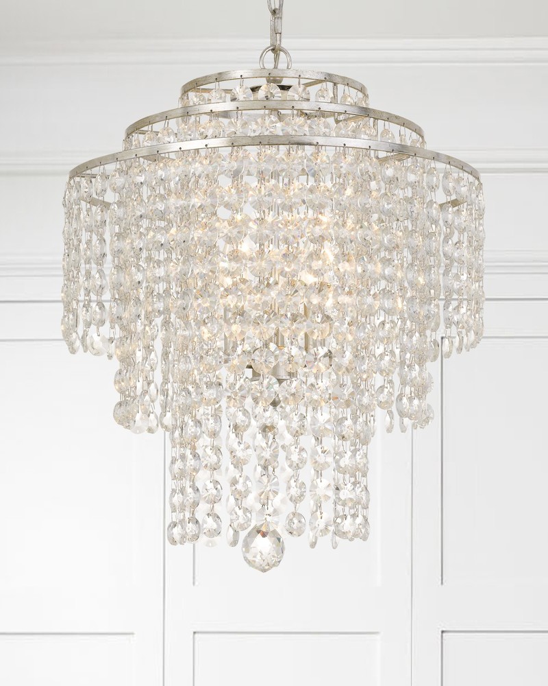 Layers of cascading crystal strands are arranged on a circular tiered frame creating optimal sparkle. A perfect complement to enhance your space, this chandelier will dazzle a room with its beautiful silhouette.