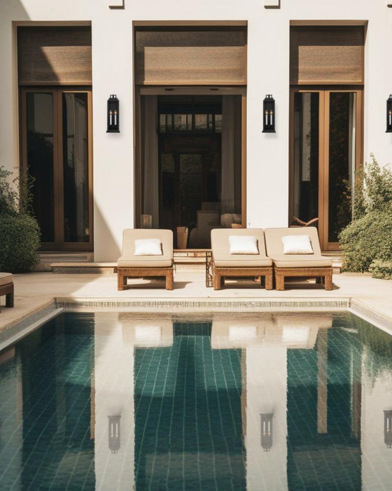 The Aspen Collection features clear glass panels and a sleek black metal frame, blending classic charm with contemporary style. The elongated lantern design showcases a flat geometric arm securely fastened to a rectangular top, creating a striking visual effect. A unique feature of the Aspen Collection is the versatile candle sleeves that ship with both white and gold finishes, allowing you to customize the look to suit your aesthetic preferences. With the Aspen Collection, you can transform your outdoor space into a welcoming oasis of timeless beauty, making a lasting impression on all who visit your home.