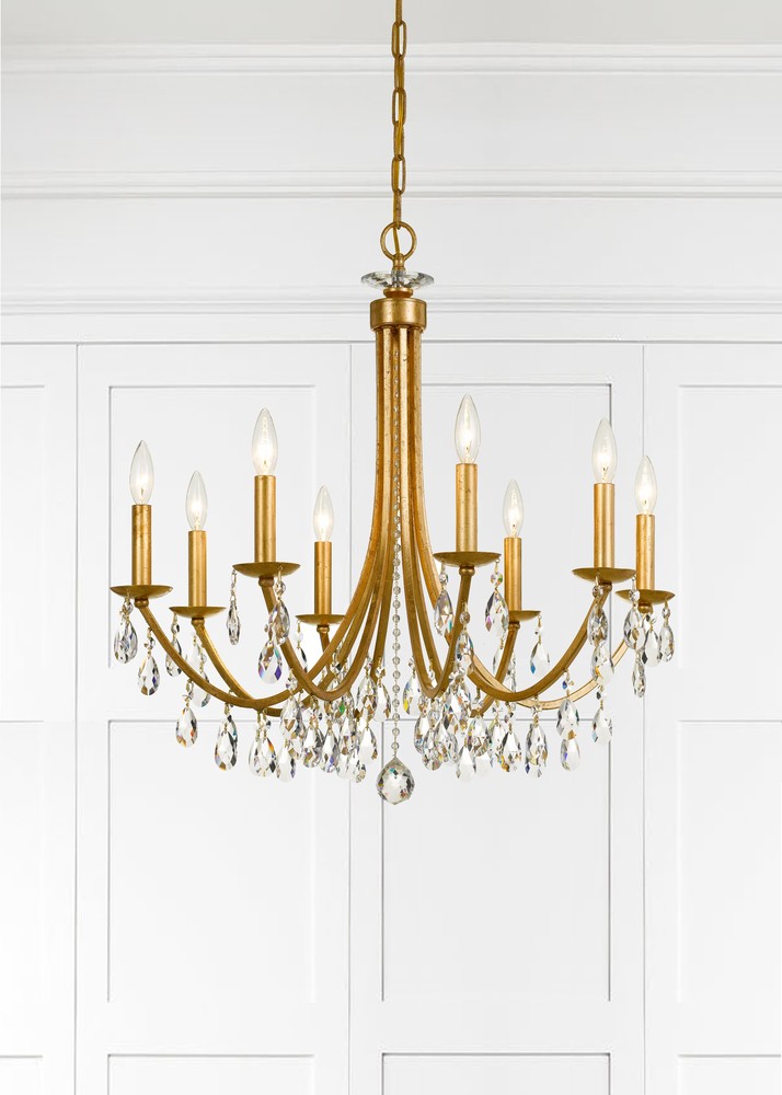 A classic yet moderns style with slim, upward curved arms strung in curtains of faceted crystal jewels, create visual interest. Complementary to a variety of home décor styles this chandelier will work in any space.