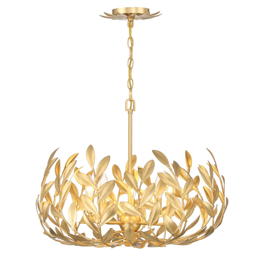 Drawing inspiration from the beauty of nature, this inverted pendant, adorned with upward-sweeping vines, exudes an enchanting allure allowing the Broche Collection to capture the essence of the outdoors. Available in three finishes - silver, white, and gold - this fixture features hand-painted wrought iron leaves delicately wrapped around the frame. The fusion of textures, from the intricate leaves to the organic vines, offers a visual delight with abundant captivating details while casting a warm, inviting glow on the iron.