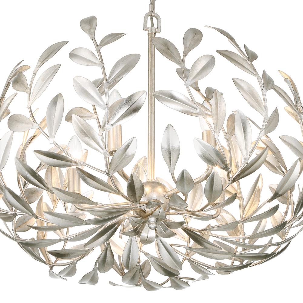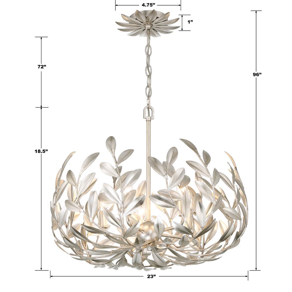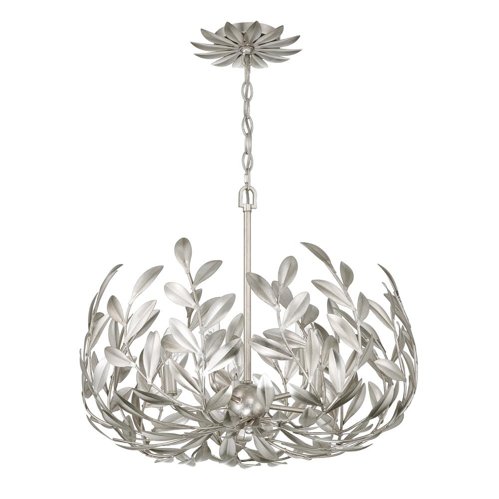 Drawing inspiration from the beauty of nature, this inverted pendant, adorned with upward-sweeping vines, exudes an enchanting allure allowing the Broche Collection to capture the essence of the outdoors. Available in three finishes - silver, white, and gold - this fixture features hand-painted wrought iron leaves delicately wrapped around the frame. The fusion of textures, from the intricate leaves to the organic vines, offers a visual delight with abundant captivating details while casting a warm, inviting glow on the iron.
