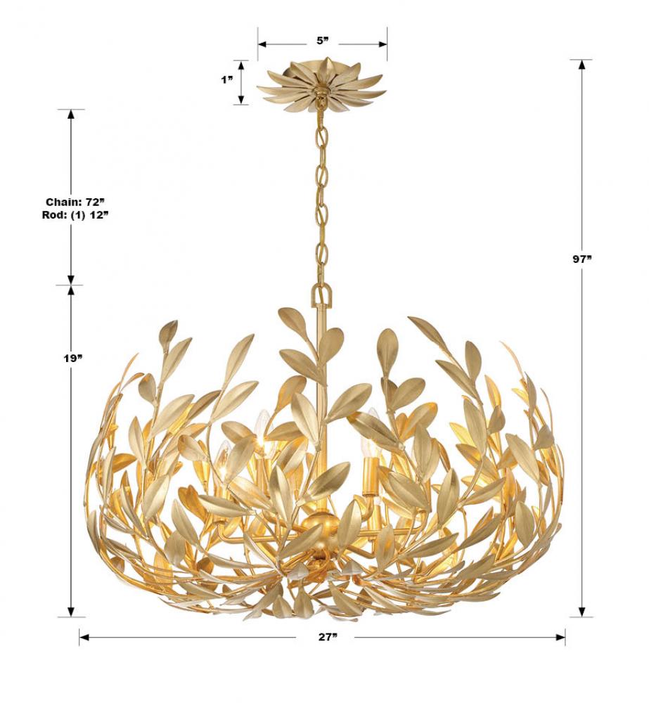 Drawing inspiration from the beauty of nature, this inverted pendant, adorned with upward-sweeping vines, exudes an enchanting allure allowing the Broche Collection to capture the essence of the outdoors. Available in three finishes - silver, white, and gold - this fixture features hand-painted wrought iron leaves delicately wrapped around the frame. The fusion of textures, from the intricate leaves to the organic vines, offers a visual delight with abundant captivating details while casting a warm, inviting glow on the iron.