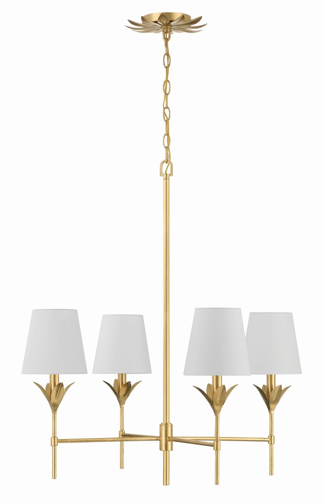 The Broche 4 Light Chandelier embodies a harmonious blend of traditional and modern elements. This fixture exudes timeless elegance with its candelabra-style frame and white linen shades. The layered wrought iron leaves create a stunning and functional display of light. Whether in a bedroom, living area, or kitchen, this chandelier adds a touch of refined glamour to any space, making it perfect for transitional and modern designs.