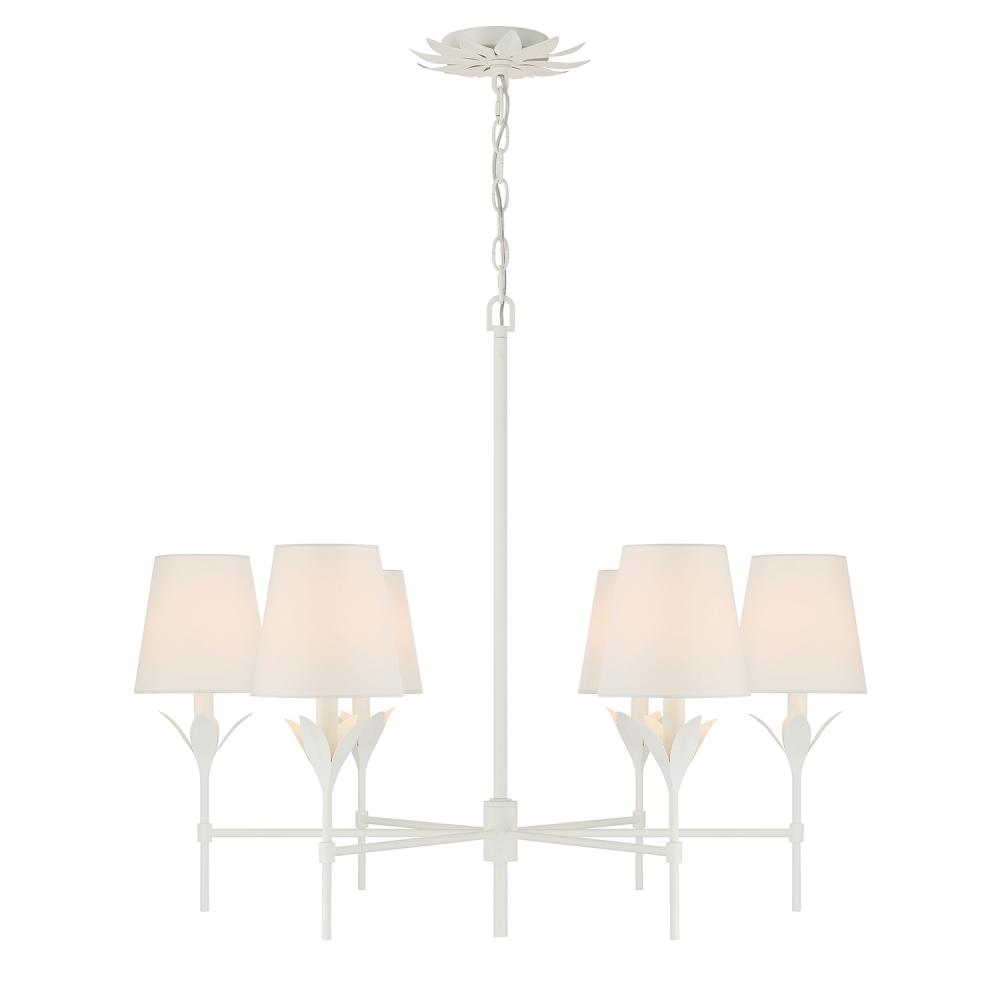 The Broche 6 Light Chandelier embodies a harmonious blend of traditional and modern elements. This fixture exudes timeless elegance with its candelabra-style frame and white linen shades. The layered wrought iron leaves create a stunning and functional display of light. Whether in a bedroom, living area, or kitchen, this chandelier adds a touch of refined glamour to any space, making it perfect for transitional and modern designs.