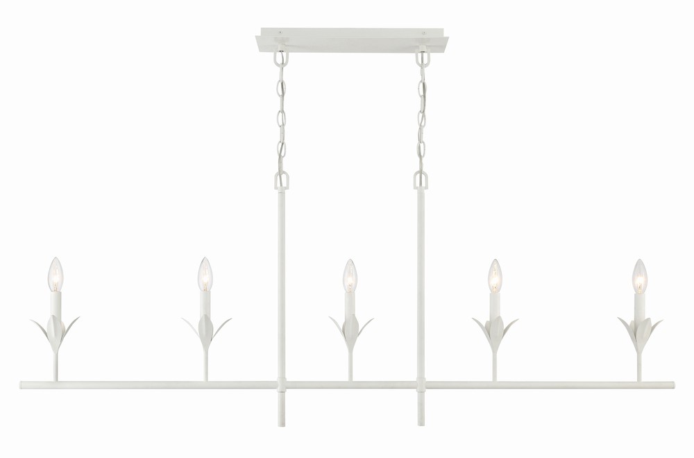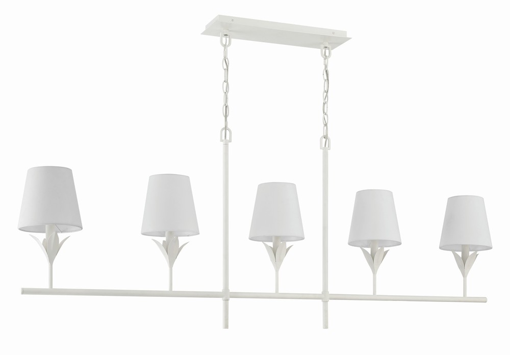 The Broche 5 Light linear Chandelier embodies a harmonious blend of traditional and modern elements. This fixture exudes timeless elegance with its candelabra-style frame and white linen shades. The layered wrought iron leaves create a stunning and functional display of light. Whether in a dining room, or over a kitchen island, this chandelier adds a touch of refined glamour to any space, making it perfect for transitional and modern designs.