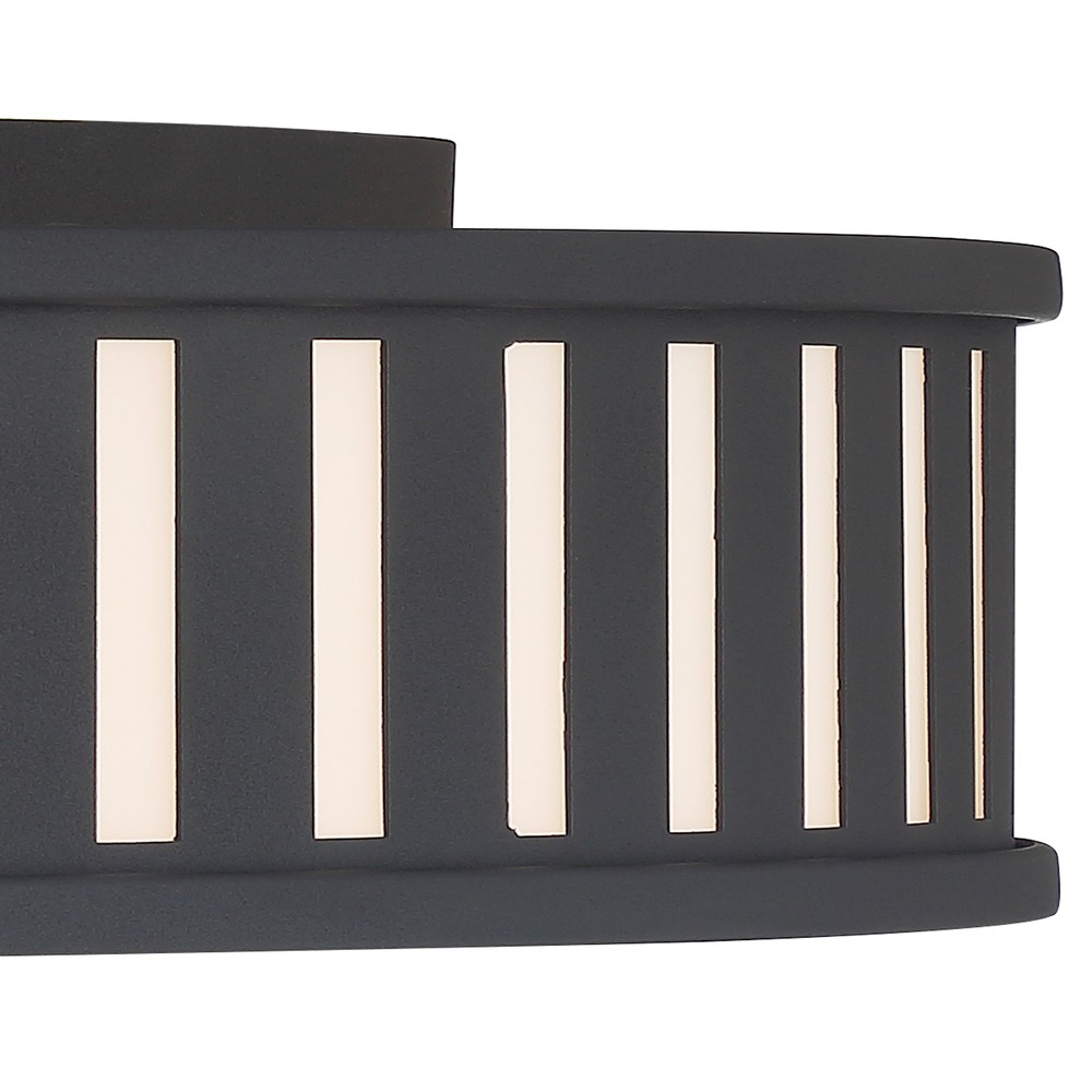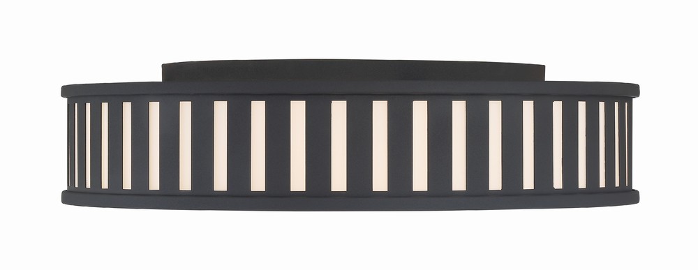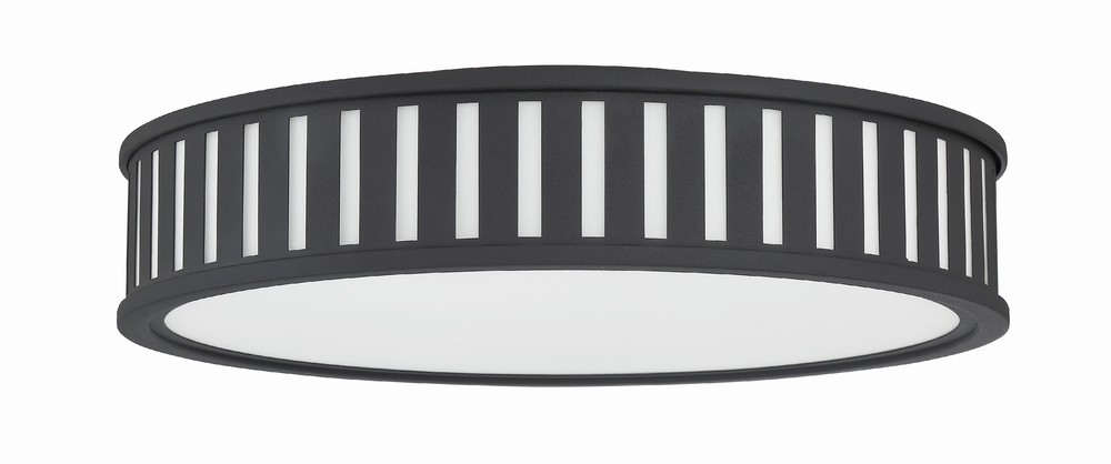 The contemporary Kendal collection makes a statement with its graphic uniform pattern. Its metal frame surrounds white glass in this elegant drum-shaped ceiling mount. The high contrast of Vibrant Gold, Black Forged, or Polished Nickel against white glass is a great way to add a touch of drama to a room.