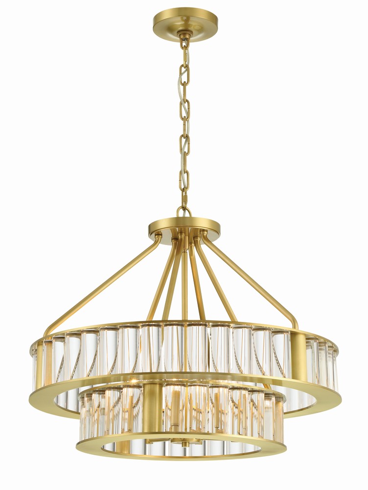 The Libby Langdon Farris chandelier is a study of simple elegance. The two-tier frame is made up of thick solid glass rods and a sleek and lean circular metal frame in a brushed, Vibrant Gold brass finish. The upper metal rods that connect both tiers to the canopy are round and have a slight eased bend as they meet the round frame to add a little softness. The Farris chandelier is as beautiful to look at from the bottom as it is to see it from the side; the scale and size of the piece feel luxurious and substantial without feeling clunky or too heavy.