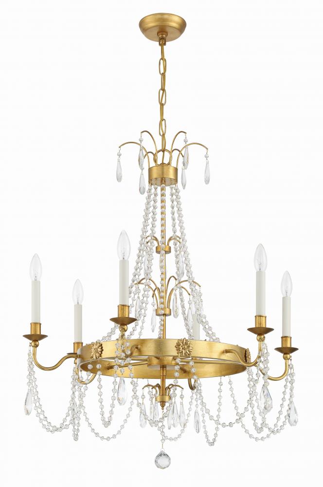 Sweeping arms dressed with strands of crystals.