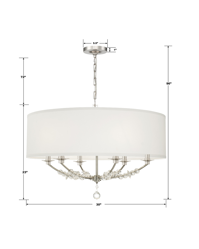 The eye catching design of the Mirage collection features a polished nickel base with arms dressed in faceted oversized crystal beads. The crisp white silk shade atop the candelabra bulbs exuding soft, ambient glow that is perfect for a contemporary appeal. Stylish, modern and minimal, the Mirage brings luxurious appeal to a variety of interior spaces.