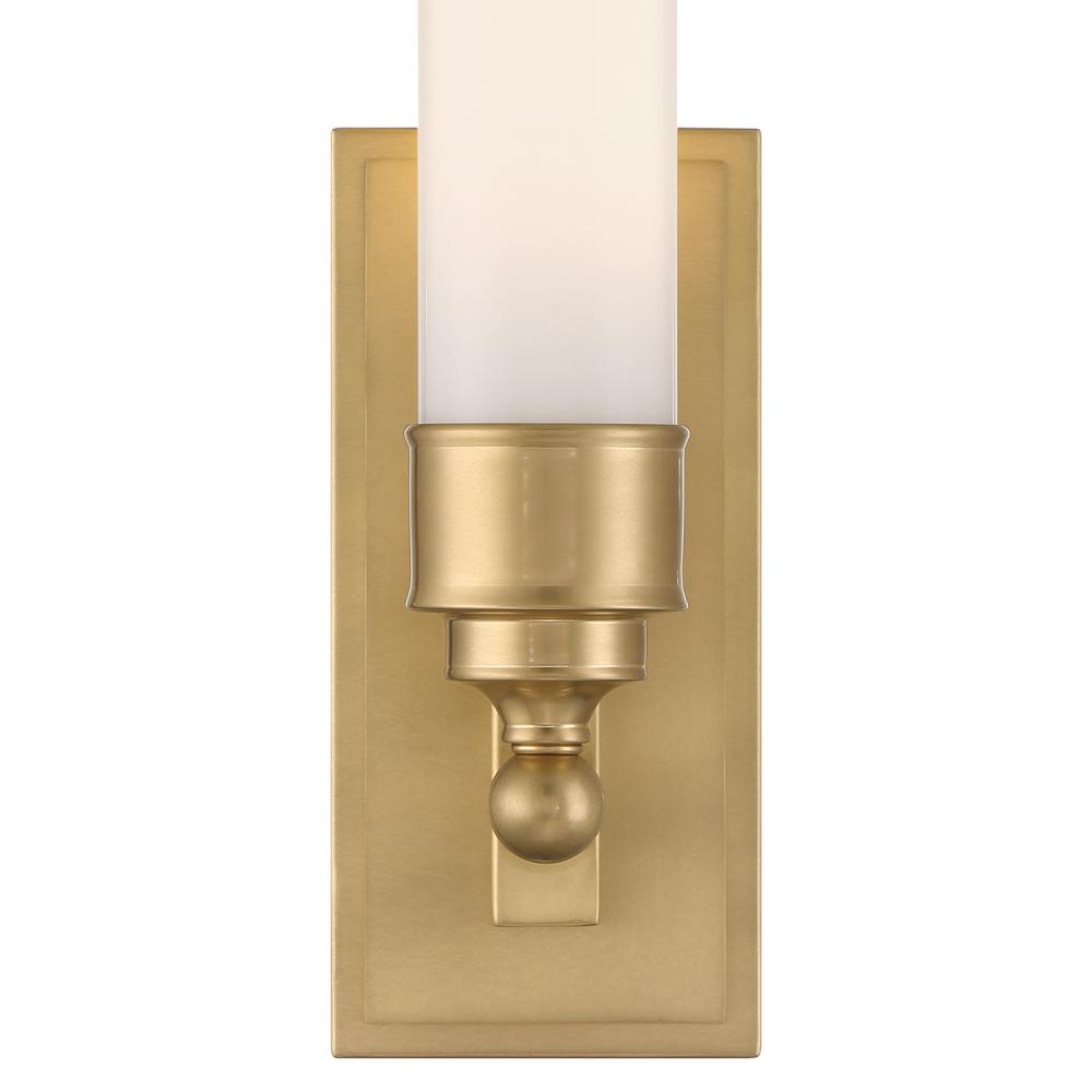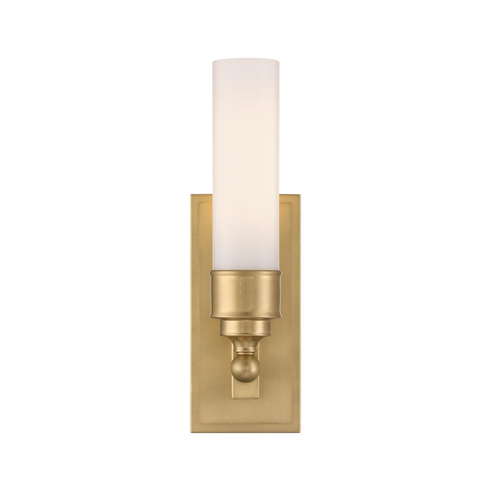 White cylindrical glass shade and rectangular back plate with stepped detailing. LED bulb included.